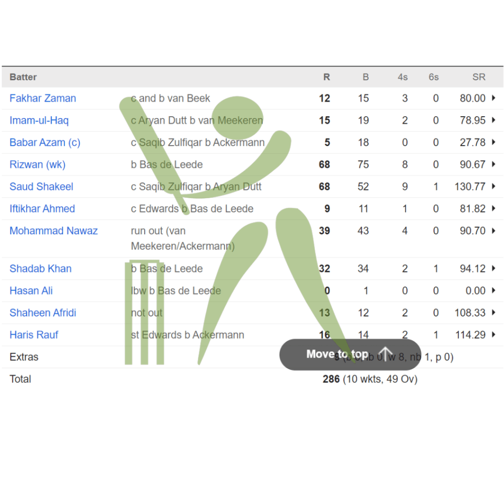 In the end, Pakistan managed to reach a total of 286, which was considered a par score, thanks to the contributions of Rizwan, Shakeel, and the lower-order batsmen. The Netherlands bowled well with the new ball and put up a fairly disciplined performance but lost some of their sheen in the death overs. Bas de Leede was the standout performer in the bowling department for the Netherlands with a four-wicket haul.
