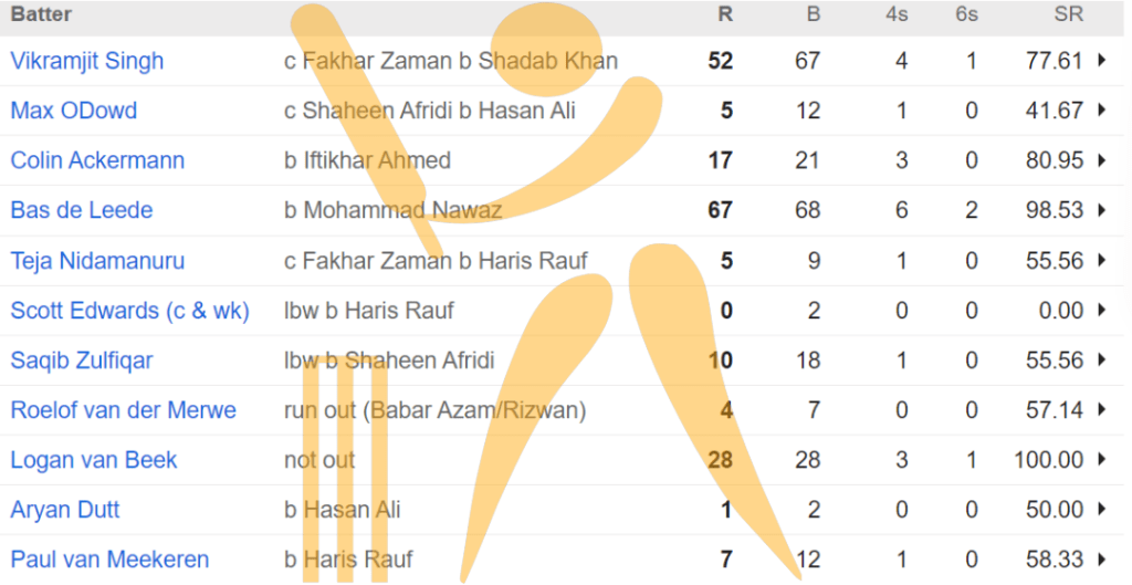 However, Pakistan lost wickets at regular intervals, and the partnership that looked promising for a 300-plus total was broken. Aryan Dutt’s off-spin accounted for Shakeel’s wicket as he played a loose shot. Rizwan was dismissed by a good delivery from Bas de Leede, who also got rid of Iftikhar Ahmed in the same over.